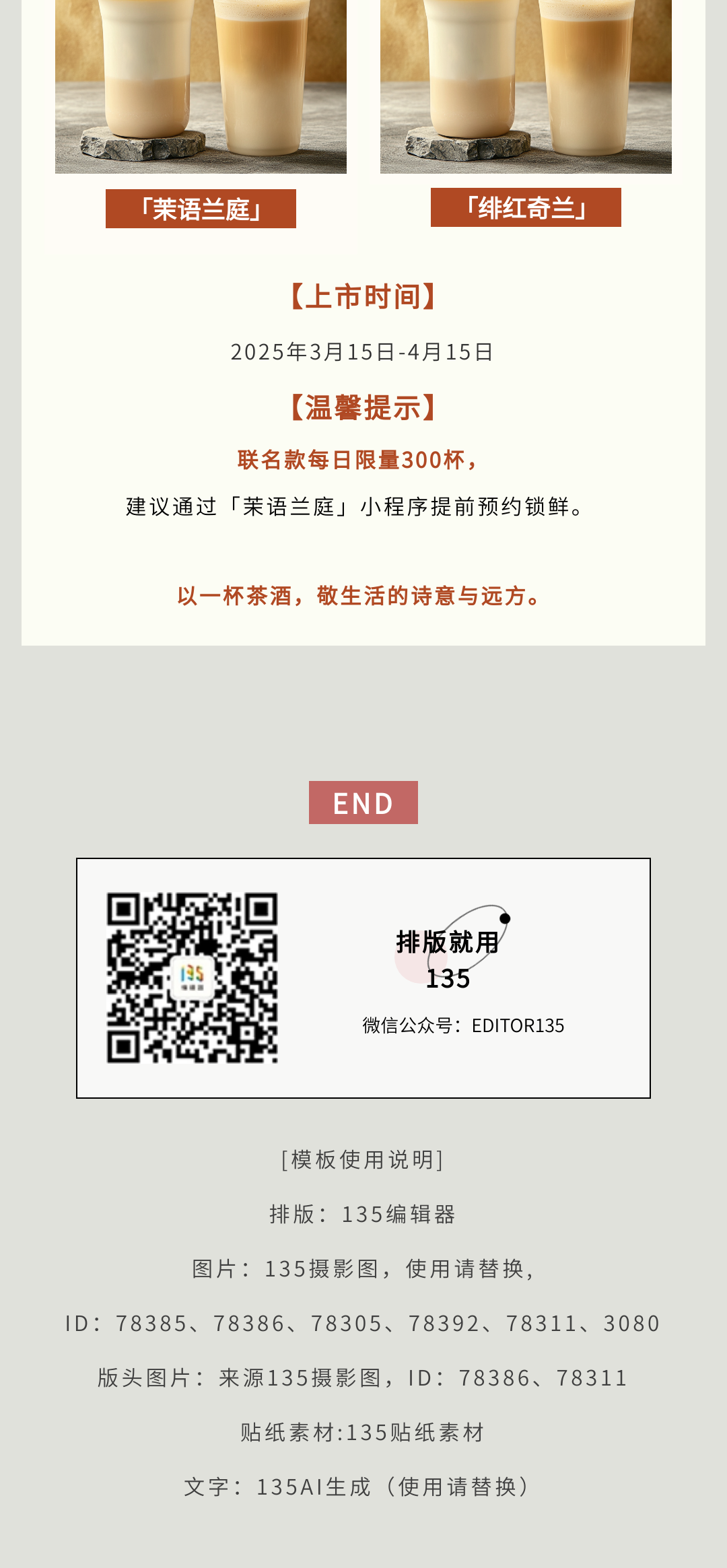 別讓飲品栽在"土味排版"上!2025年10月135編輯器食品飲料主題模板上新,含奶茶推廣(ID:159593)、牛奶促銷(ID:158059)、酒業(yè)宣傳等多風(fēng)格設(shè)計(jì),直接套用提升品牌質(zhì)感!