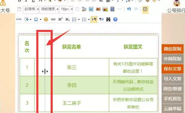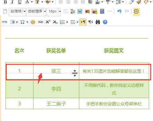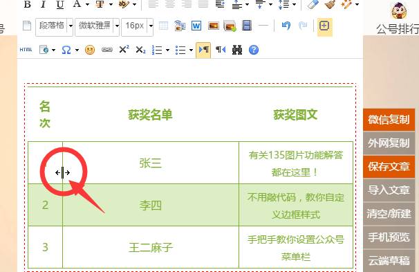 目前,135編輯器里的表格支持拖動(dòng)表格行列,控制行列寬度或高度。