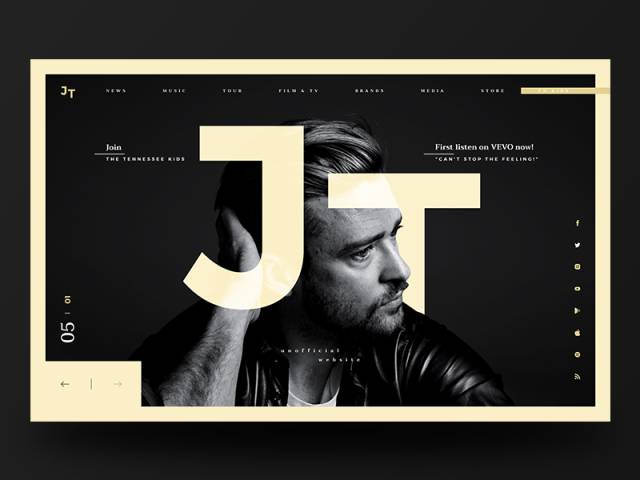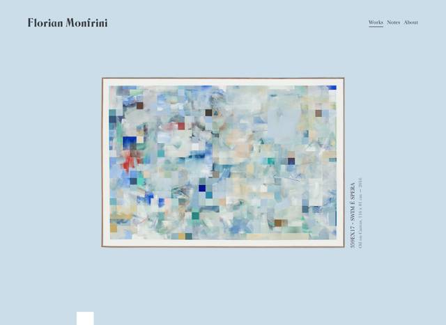 另外一種簡單的操作方法是直接在背景圖片中添加文案,做到真的圖文一體。Florian Monfrini主圖模仿了美術(shù)館的一面墻,文案以豎排的形式置于藝術(shù)品的周圍,氛圍感十足。