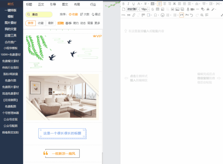 現(xiàn)在的第三方排版工具已經(jīng)多到讓人數(shù)不清,每個(gè)排版網(wǎng)站里的樣式也是五花八門(mén),如果一個(gè)一個(gè)下拉查找的話效果非常低,利用好功能搜索,能夠比較快速地幫我們找到想要地樣式。