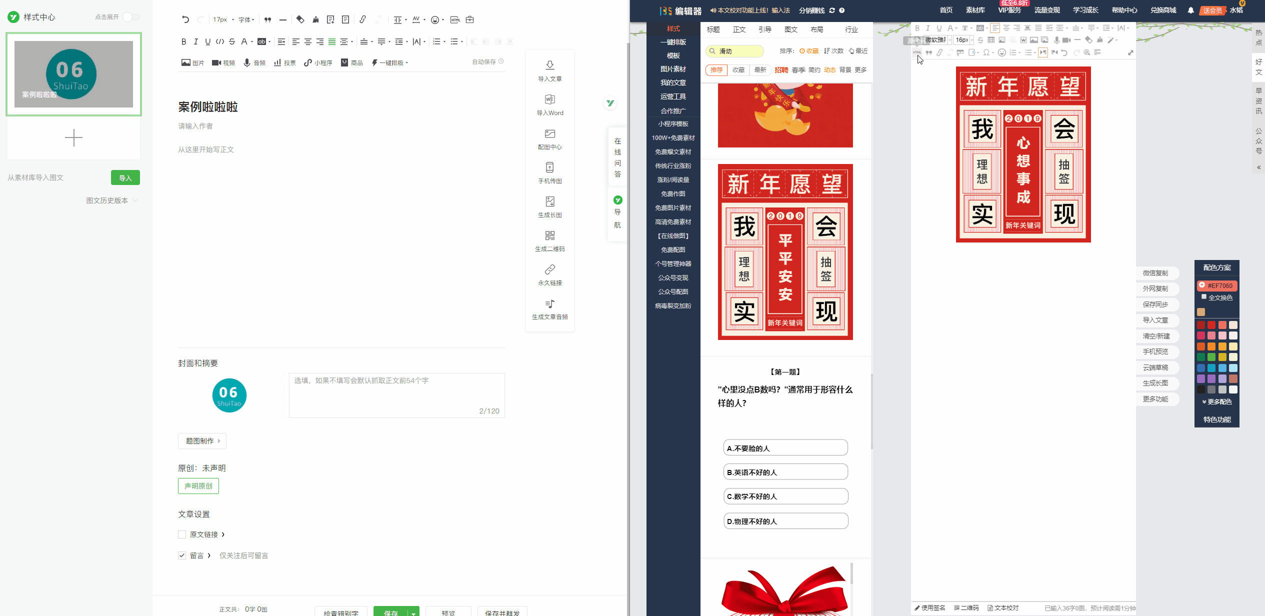 輯在第三方平臺(tái)編輯完成后,我們只需要將編輯好的樣式復(fù)制粘貼到公眾號(hào)后臺(tái)即可,如果你將公眾號(hào)綁定在了第三方編輯器,就可以直接同步,但如果沒(méi)有,通過(guò)簡(jiǎn)單的Ctrl + C/V ,也不會(huì)特別麻煩。