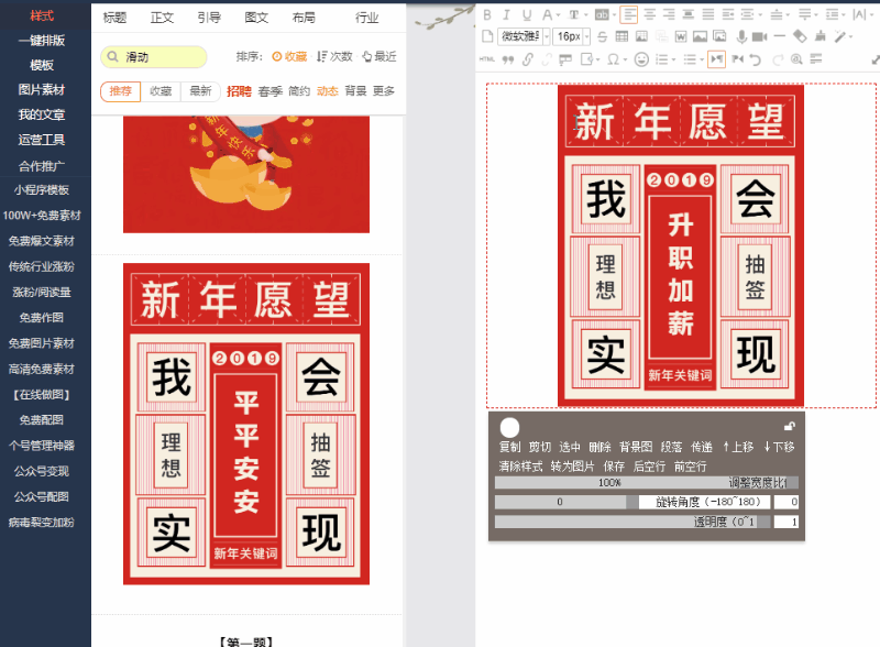 在135編輯器找到相應(yīng)的樣式后,我們直接上傳圖片到圖庫(kù),再替換原本樣式圖片即可,文字樣式同理。一般第三方網(wǎng)站會(huì)對(duì)圖片的數(shù)量上傳有所限制,如果需求大可能需要充會(huì)員了。