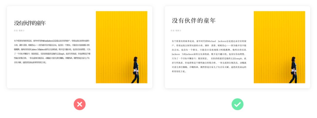 在頁面中,文字是重要的信息來源,所以保證可讀性,是文字排版中首要考慮的事情。影響文字可讀性的因素很多,但在眾多問題中,流暢的閱讀排版是保障可讀性的基礎(chǔ)。在排版中控制好文本的長度、字距、行距、段落與對齊方式,就能夠有效的提高可讀性。左圖中,文字成為了畫面的裝飾元素,忽視了文字本身所承載的信息;而在右圖中,文字是一種功能,用來傳遞信息。
