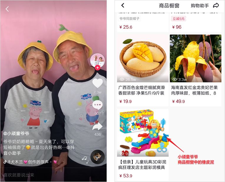 和吃貨奶奶一樣,小頑童爺爺也不是抱著賣貨的心態(tài)來到平臺。后來隨著人氣的增加,小頑童爺爺?shù)臋淮袄镆灿猩唐妨?,雖然品類不多,但商品大都是和他們真誠、樸實、可愛的人設(shè)符合的,但是也有看似和他們完全不搭邊的產(chǎn)品,比如兒童玩具橡皮泥。