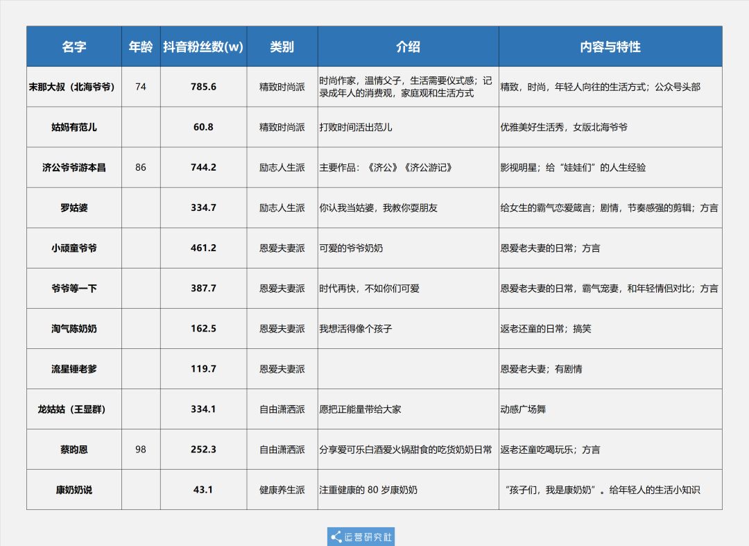 特別值得注意的是,從抖音粉絲數(shù)和點贊數(shù)綜合來看,除老牌紅人@末那大叔 和@濟(jì)公爺爺 外,點贊量比較高的還有@爺爺?shù)纫幌?nbsp;和@小頑童爺爺,他們的內(nèi)容題材都是老年夫妻恩愛日常。